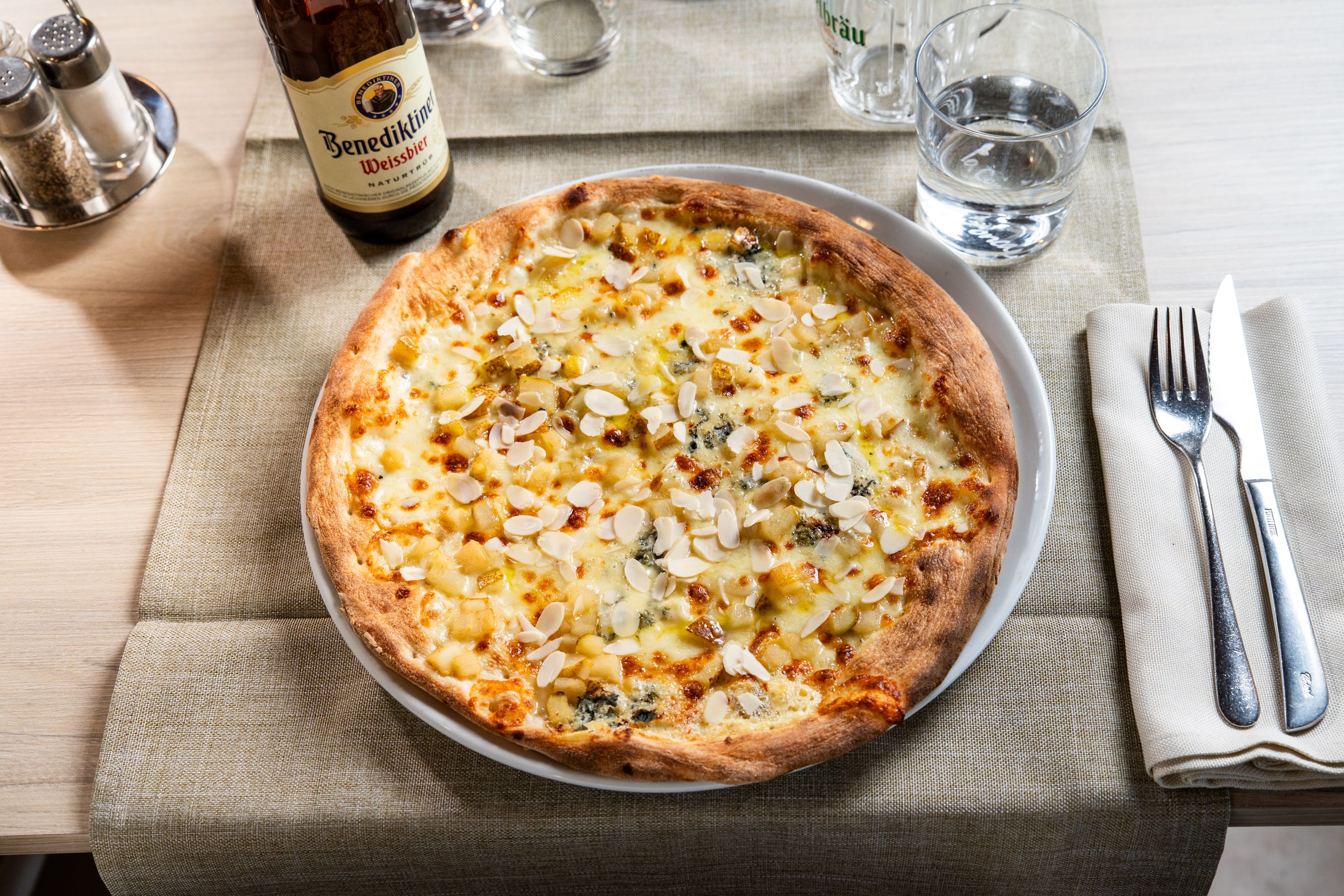 MOZZARELLA, GORGONZOLA, PERA CONFIT E LAMELLE DI MANDORLE 9.3€