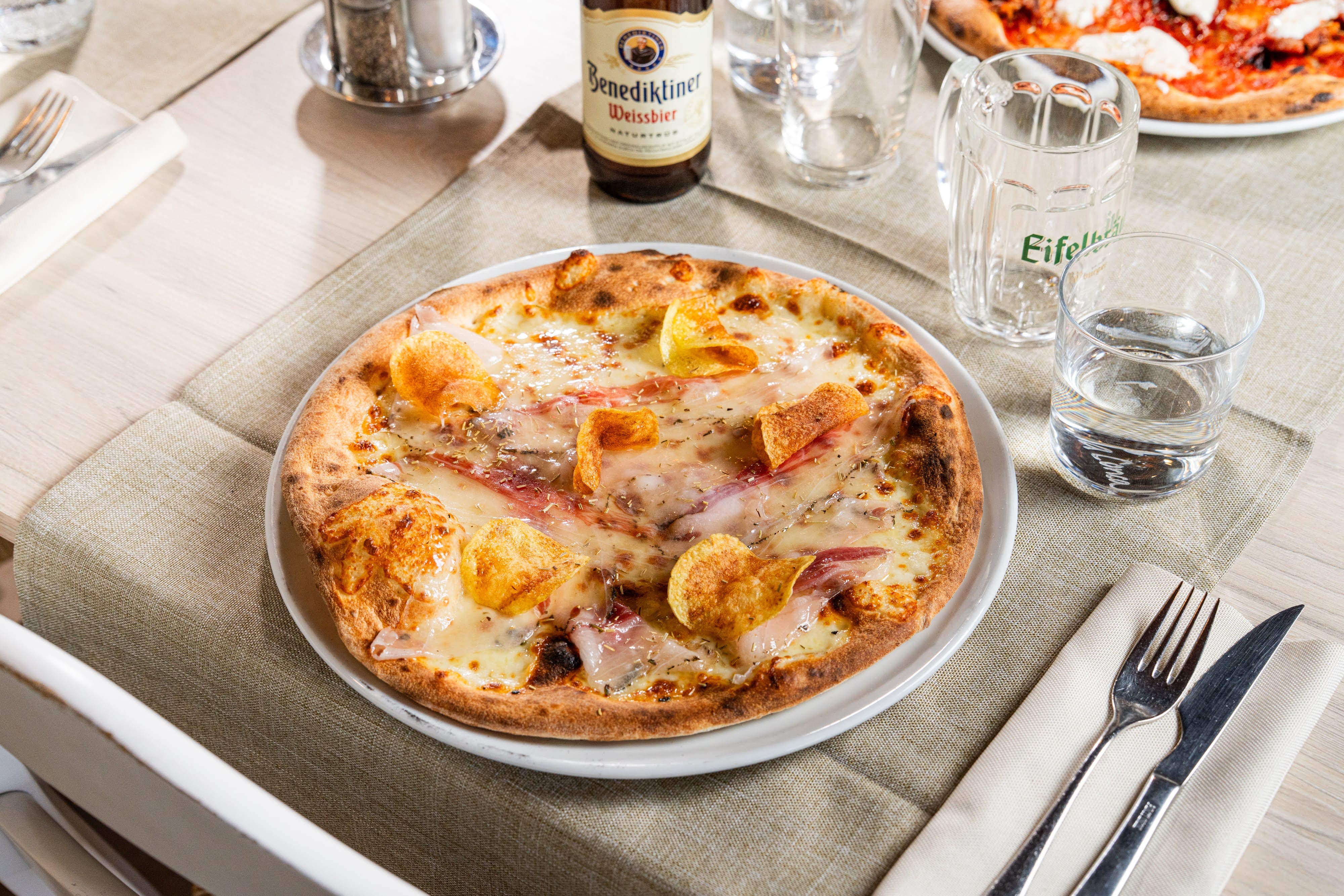 POMODORO, MOZZARELLA, PANCETTA AL PEPE, PATATE AL FORNO, BRIE, SALAMINO PICCANTE, PEPERONI, OLIO ALL'AGLIO E ORIGANO 11.9€